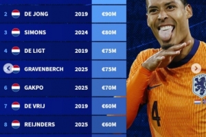 荷蘭球員歷史身價榜:范迪克1億歐居首,弗蘭基-德容9000萬歐次之