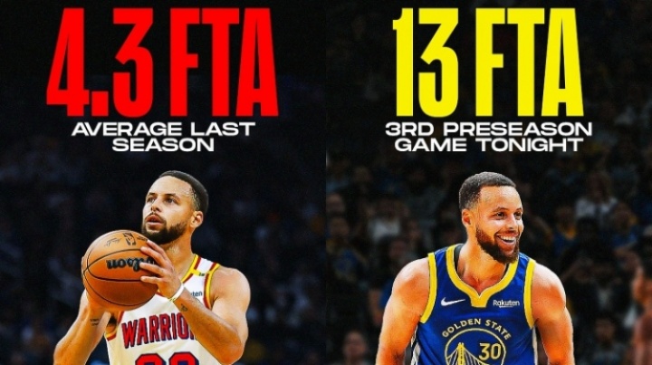 對陣開拓者的第三場季前賽中,庫里獲得了13次罰球機會。盡管他上賽季場均突破次數(shù)位列聯(lián)盟前15,但其場均罰球數(shù)僅為4.3次。