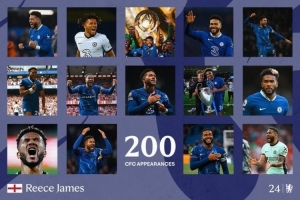 切爾西官推曬出海報(bào),并寫道:“200場里程碑取得進(jìn)球,里斯-詹姆斯是純血切爾西人。”