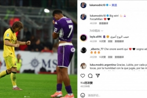 莫德里奇曬出了自己的賽場照,配文寫道:“偉大的勝利!Forza Milan?!?/p>
