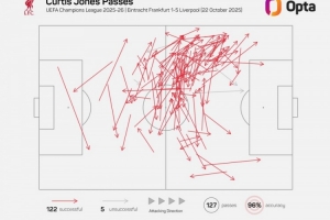 此役柯蒂斯-瓊斯為利物浦踢滿全場,成功傳球122次,這是2003-2004賽季Opta統(tǒng)計相關數(shù)據以來,利物浦球員歐冠單場成功傳球紀錄。