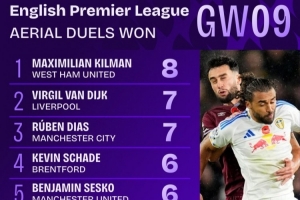 體育資訊10月28日訊 英超第9輪戰(zhàn)罷,據Squawka數(shù)據統(tǒng)計,西漢姆后衛(wèi)基爾曼是本輪贏得空中對抗次數(shù)最多的球員,共計8次。