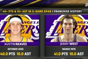 在最近的三場(chǎng)比賽中,里夫斯場(chǎng)均得到40分10助攻,隊(duì)史第二人,比肩杰里-韋斯特。