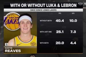 小里數據:無詹無東40.4分10助,有其中一人場均25.1分7.3助,有詹有東20分4.4助