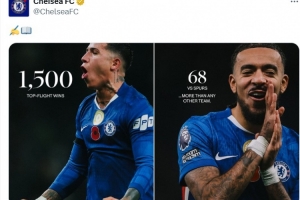 本場(chǎng)比賽也是切爾西隊(duì)史收獲的第1500場(chǎng)頂級(jí)聯(lián)賽勝利,其中對(duì)陣熱刺68場(chǎng)勝利是所有對(duì)手中最多的,藍(lán)軍官推也曬出海報(bào)紀(jì)念達(dá)成這一里程碑時(shí)刻。