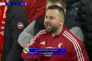 登場時,阿諾德遭到了紅軍球迷的“熱烈歡迎”:安菲爾德噓聲四起,鏡頭給到的一位球迷向他手指著胸前的利物浦隊徽,口中念念有詞,隨后這位球迷還低頭親吻了隊徽。