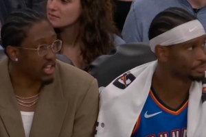 比賽最后時刻,鏡頭給到板凳席上的雷霆眾將,亞歷山大和仍在養(yǎng)傷的杰倫·威廉姆斯神同步。