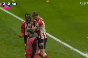 體育資訊11月09日訊 英超第11輪,阿森納客戰(zhàn)桑德蘭。補(bǔ)時第94分鐘,布羅比側(cè)勾破門,拉亞出擊未撲到,桑德蘭2-2阿森納!