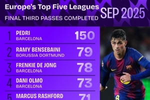 體育資訊10月1日訊 巴薩在9月份的6場比賽中,取得5勝1平。其中巴薩中場佩德里功不可沒,他被喻為哈維和伊涅斯塔的結(jié)合體。據(jù)Squawka數(shù)據(jù)統(tǒng)計,在9月份歐洲五大聯(lián)賽進攻三區(qū)成功傳球次數(shù)榜單中,佩德里以150次斷崖領先。