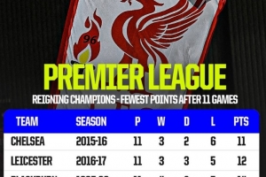 體育資訊11月10日訊 在本輪英超,利物浦0-3不敵曼城,11輪過后只得到18分,OPTA也盤點(diǎn)了英超歷史衛(wèi)冕冠軍在前11輪過后最少積分情況,本賽季利物浦排在第四,具體如下: