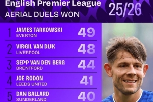 體育資訊11月11日訊 英超聯(lián)賽已經(jīng)進行了11輪,squakwa也統(tǒng)計了本賽季英超空中成功對抗次數(shù),塔科夫斯基力壓范戴克居首。