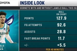 黃蜂自媒體曬出數(shù)據(jù),當(dāng)拉梅洛出站時,黃蜂每48分鐘凈負8.5分,當(dāng)他缺陣時,48分鐘凈勝5.5分。