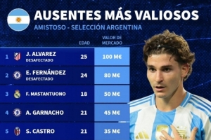 體育資訊11月12日訊 德國(guó)轉(zhuǎn)會(huì)市場(chǎng)統(tǒng)計(jì)了缺席本期阿根廷隊(duì)球員的身價(jià),并列出榜單,阿爾瓦雷斯1億歐居首,恩佐-費(fèi)爾南德斯8000萬歐次席。