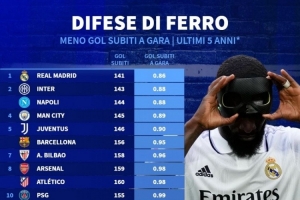 體育資訊11月15日訊 德國轉(zhuǎn)會(huì)市場統(tǒng)計(jì)了2020-2021賽季以來球隊(duì)在五大聯(lián)賽中的場均失球,并列出場均失球最少榜單,皇馬0.86球居首,國米、那不勒斯前三。