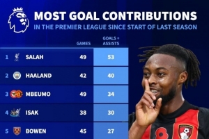 體育資訊11月18日訊 德國轉(zhuǎn)會市場統(tǒng)計了上賽季至今球員在英超參與進球的數(shù)量,并列出榜單,薩拉赫53球居首,哈蘭德40球次席,姆伯莫34球第三。