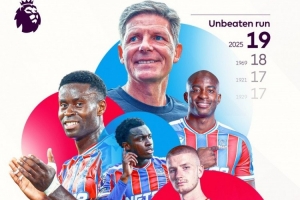 據(jù)英超官方統(tǒng)計(jì),水晶宮各賽事19場(chǎng)不敗,創(chuàng)造隊(duì)史最長不敗紀(jì)錄。
