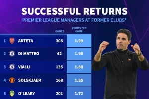 體育資訊11月21日訊 德國轉(zhuǎn)會市場統(tǒng)計(jì)了教練執(zhí)教球員時(shí)代英超老東家的場均積分,并列出榜單,阿爾特塔1.99分居首,迪馬特奧1.98分次席。