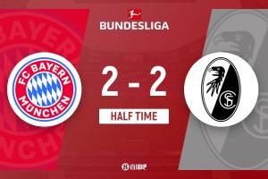上半場傷停補時3分鐘,半場結束,拜仁暫2-2弗賴堡。