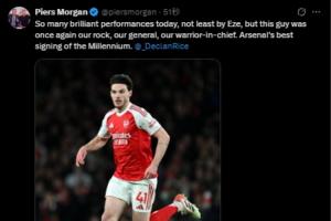 “今天有許多精彩的表現(xiàn),尤其是埃澤,但這位球員(賴斯)再次成為我們的后盾、將軍和帶隊(duì)?wèi)?zhàn)士。阿森納在千禧年最好的一筆引援!”