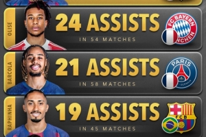 2025年五大聯(lián)賽球員助攻排名(俱樂部+國家隊(duì)):