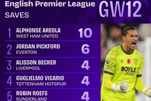 除此之外,阿利松(利物浦)、維卡里奧(熱刺)和羅賓·羅夫斯(桑德蘭)在本輪也各自完成了4次撲救。