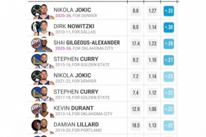 本賽季,約基奇每回合單打得1.27分,超平均水平0.33分皆是近20個(gè)賽季最高。