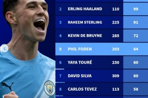 體育資訊11月30日訊 在本輪英超,曼城3-2擊敗利茲聯(lián),福登梅開二度。以下為曼城隊(duì)史英超射手榜: