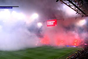 在中斷43分鐘后,比賽得以恢復(fù),但僅持續(xù)了五秒鐘。當(dāng)時(shí)又有煙花直接被扔進(jìn)球場(chǎng),導(dǎo)致主裁判尼烏斯不得不再次將球員送回更衣室以保障他們的安全。