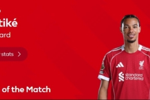 據(jù)賽后英超官方消息,利物浦前鋒埃基蒂克被評(píng)選為此役最佳球員。