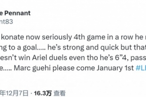 彭南特寫道:“我真是受夠科納特了,這已經(jīng)是他連續(xù)第四場(chǎng)比賽犯錯(cuò)導(dǎo)致失球了……他雖然身體強(qiáng)壯速度快,但僅此而已,技術(shù)簡(jiǎn)直糟糕透頂,明明身高1米93卻連空中對(duì)抗都贏不了,傳球水平跟業(yè)余聯(lián)賽球員沒(méi)兩樣,格伊請(qǐng)務(wù)必在1月1日加盟利物浦?!?/p>