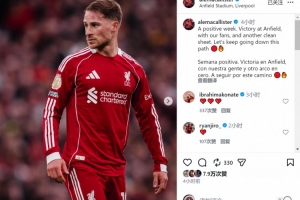 麥卡利斯特社媒曬出比賽照片,配文:“積極的一周,在安菲爾德與我們的球迷一起取得勝利,而且又一次完成零封,讓我們繼續(xù)沿著這條道路前進?!?/p>