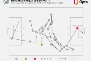 據(jù)統(tǒng)計,哈蘭德本場首粒進(jìn)球經(jīng)過了球隊25次傳球,曼城上一次在英超通過更多次傳遞破門還是去年5月羅德里對陣西漢姆的進(jìn)球(31次)。