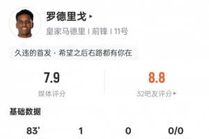 體育資訊12月15日訊 2025-26賽季西甲第16輪,皇馬對陣阿拉維斯,羅德里戈首發(fā)出戰(zhàn),打進1粒進球,1次過人成功,傳球成功率達到96.7%,評分7.9。
