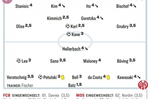 體育資訊12月15日訊 德甲第14輪比賽,拜仁主場2-2戰(zhàn)平美因茨,德國媒體《踢球者》對兩隊(duì)球員進(jìn)行了評分,奧利塞、基米希、卡爾2.5分拜仁隊(duì)內(nèi)最高。