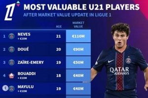 德轉列法甲U21身價榜:內維斯壓杜埃居首,布阿迪、馬尤盧在列
