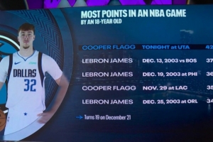 據(jù)統(tǒng)計(jì),18歲球員單場得分榜前五如圖,詹姆斯和弗拉格霸榜。