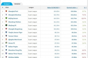 俱樂(lè)部身價(jià)方面,上海海港以1608萬(wàn)歐元排在全聯(lián)賽第一,上海申花以1281萬(wàn)歐元排第二,北京國(guó)安以1276萬(wàn)歐元排第三,山東泰山以1158萬(wàn)歐元排第四,浙江以1155萬(wàn)歐元排第五,成都蓉城以1051萬(wàn)歐元排第六,其余球隊(duì)均低于1000萬(wàn)歐元。