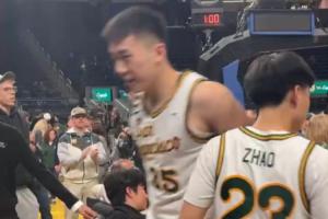 中國(guó)球員、舊金山大學(xué)后衛(wèi)趙維倫最后時(shí)刻獲得出場(chǎng)機(jī)會(huì),上場(chǎng)1分鐘沒(méi)有運(yùn)動(dòng)戰(zhàn)出手,罰球2中1,得到1分。