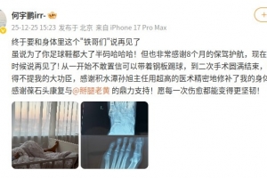 何宇鵬在社媒寫道:“終于要和身體里這個(gè)‘鐵哥們’說再見了,雖說為了你足球鞋都大了半碼哈哈哈!但也非常感謝8個(gè)月的保駕護(hù)航,現(xiàn)在,是時(shí)候說再見了!”