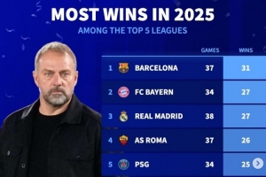 體育資訊1月1日訊 2025年已經(jīng)結(jié)束,《轉(zhuǎn)會(huì)市場》也統(tǒng)計(jì)了本年度五大聯(lián)賽勝場最多情況,巴薩獨(dú)自居首。