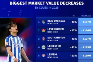 體育資訊1月2日訊 2025年已經(jīng)結(jié)束,《轉(zhuǎn)會市場》也統(tǒng)計(jì)了年度球隊(duì)身價貶值榜,皇社、藥廠分列前二。