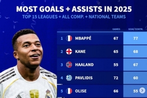 體育資訊1月2日訊 2025年已經(jīng)過去,《轉(zhuǎn)會(huì)市場(chǎng)》也統(tǒng)計(jì)了2025前15聯(lián)賽球員的俱樂部+國(guó)家隊(duì)各項(xiàng)賽事總參與進(jìn)球情況,皇馬前鋒姆巴佩領(lǐng)跑。
