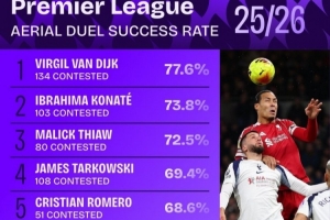 體育資訊1月3日訊 數(shù)據(jù)機構(gòu)squawka統(tǒng)計了本賽季英超爭頂成功率情況,利物浦雙中衛(wèi)包攬前二。