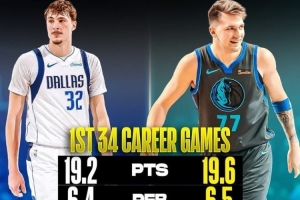 美媒對(duì)比了弗拉格和東契奇在菜鳥(niǎo)賽季球隊(duì)前35場(chǎng)比賽的數(shù)據(jù)對(duì)比,巧合的是兩人都在35場(chǎng)比賽里出戰(zhàn)34場(chǎng),數(shù)據(jù)如下: