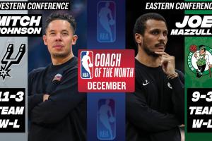 體育資訊01月03日訊 NBA官方宣布,凱爾特人馬祖拉與馬刺米奇·約翰遜分別當(dāng)選12月最佳教練。