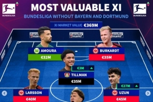 體育資訊10月15日訊 德轉(zhuǎn)更新了德甲球員身價(jià),同時(shí)列出德甲除拜仁多特外身價(jià)最高的球員陣容,法蘭克福5人、勒沃庫森2人,斯蒂勒盧克巴在列。