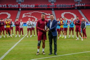 今天的官方訓(xùn)練開始前,俱樂部為兩位球員舉行頒獎(jiǎng)儀式。俱樂部總經(jīng)理沙良昌為萊昂納多頒發(fā)第25輪最佳球員獎(jiǎng)杯,為李帥贈(zèng)送百場紀(jì)念球衣。