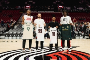 體育資訊11月4日訊 美職聯(lián)波特蘭伐木工隊球員大衛(wèi)-達-科斯塔、維爾德在美職聯(lián)季后賽間隙到主場支持開拓者。球隊也由格蘭特、西索科做代表送出了定制球衣。