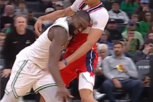 >>又一個(gè)受害者??杰倫·布朗撞到K·喬治發(fā)際線粉全粘白" />