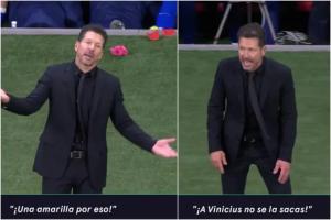 在一次犯規(guī)判罰之后,鏡頭拍到了馬競主帥西蒙尼正在對主裁曼薩諾抗議:“嘿!你在吹什么!冷靜點(diǎn)!就為了這個(gè)出牌?”西蒙尼最后又搖著頭說:“你不敢對維尼修斯出牌?!比缓笏侄⒅谒墓賳T重復(fù)了一遍這句話。